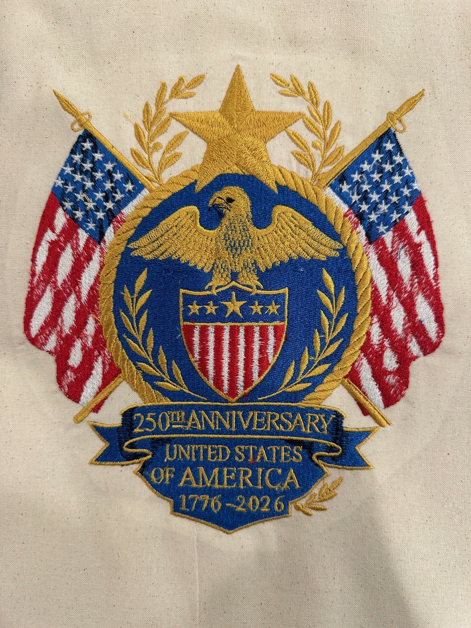 An embroidered canvas tote bag featuring the US Flag, a golden eagle and the 250th Anniversary of the United States of America, with the 1776 - 2026 dates. This tote bag is a great item for carrying to festivals, fairs, farmers markets, or to store your favorite items. It makes a great gift to commemorate this once in a lifetime event. The tote measures 15x14.5 inches.