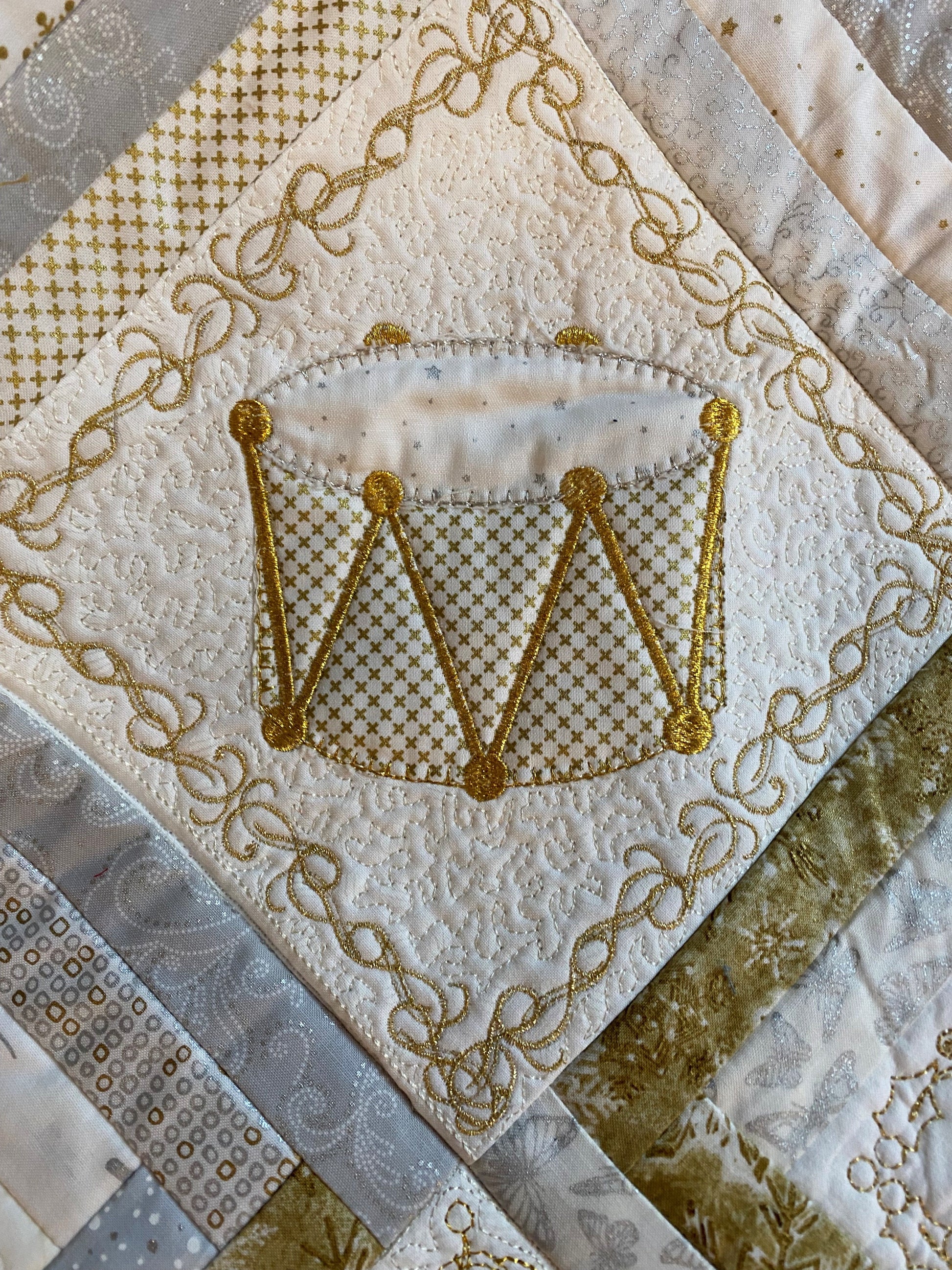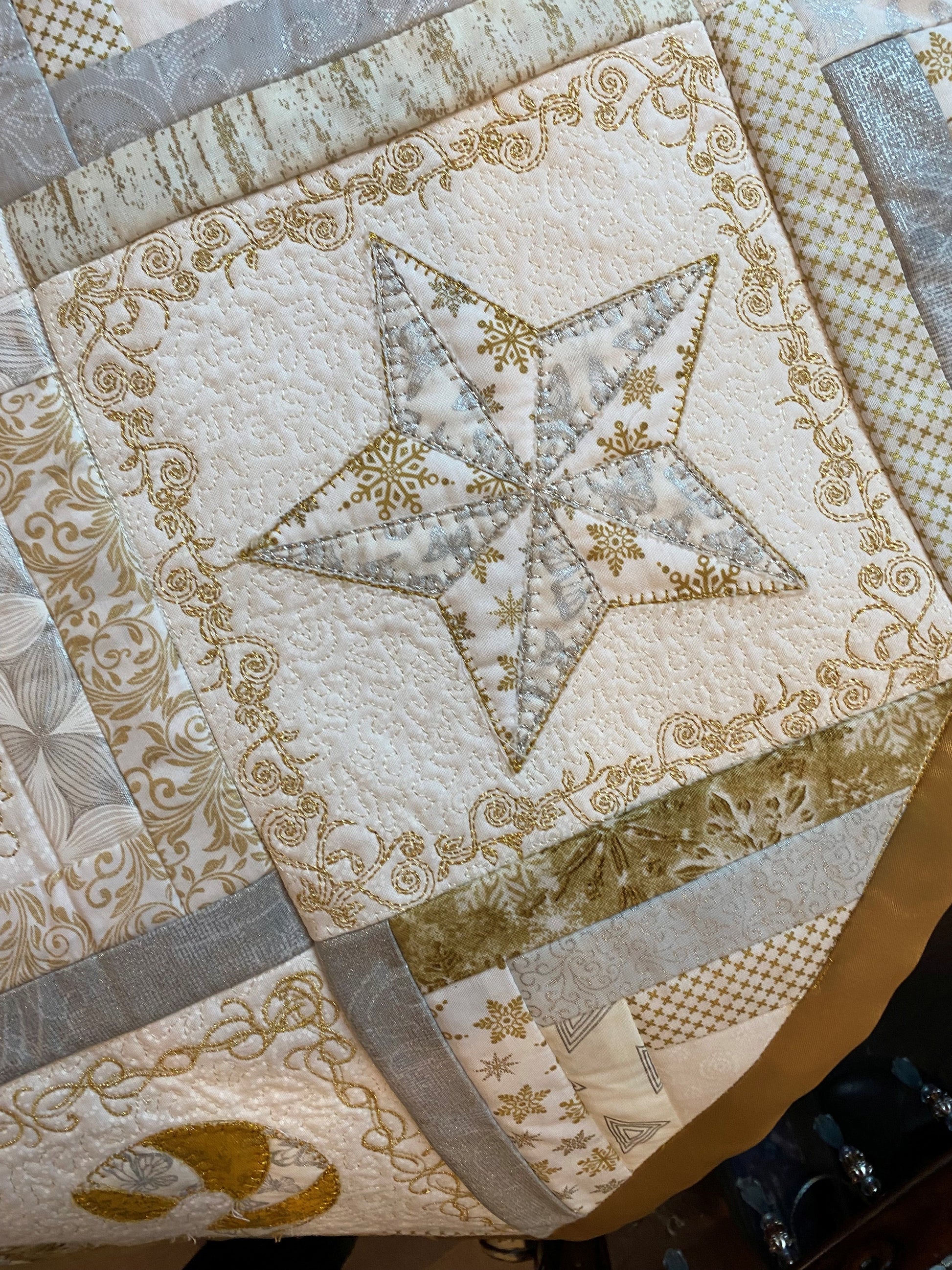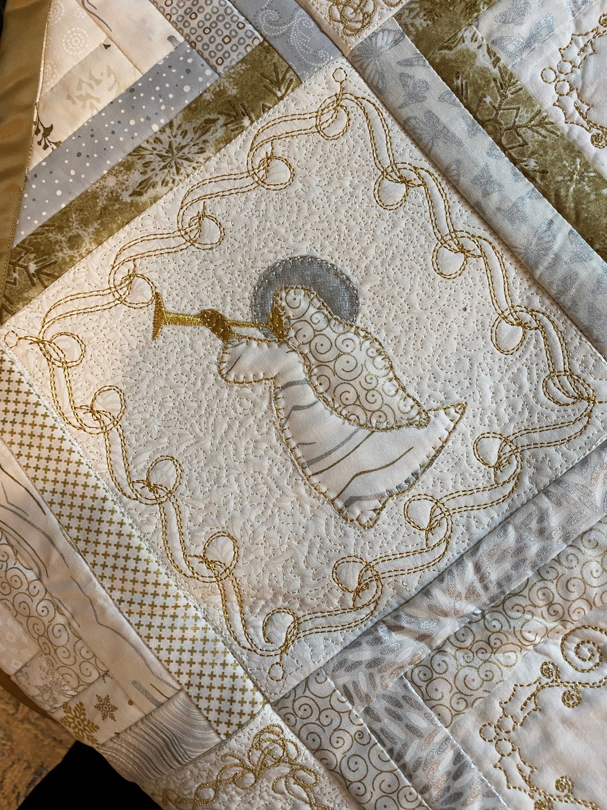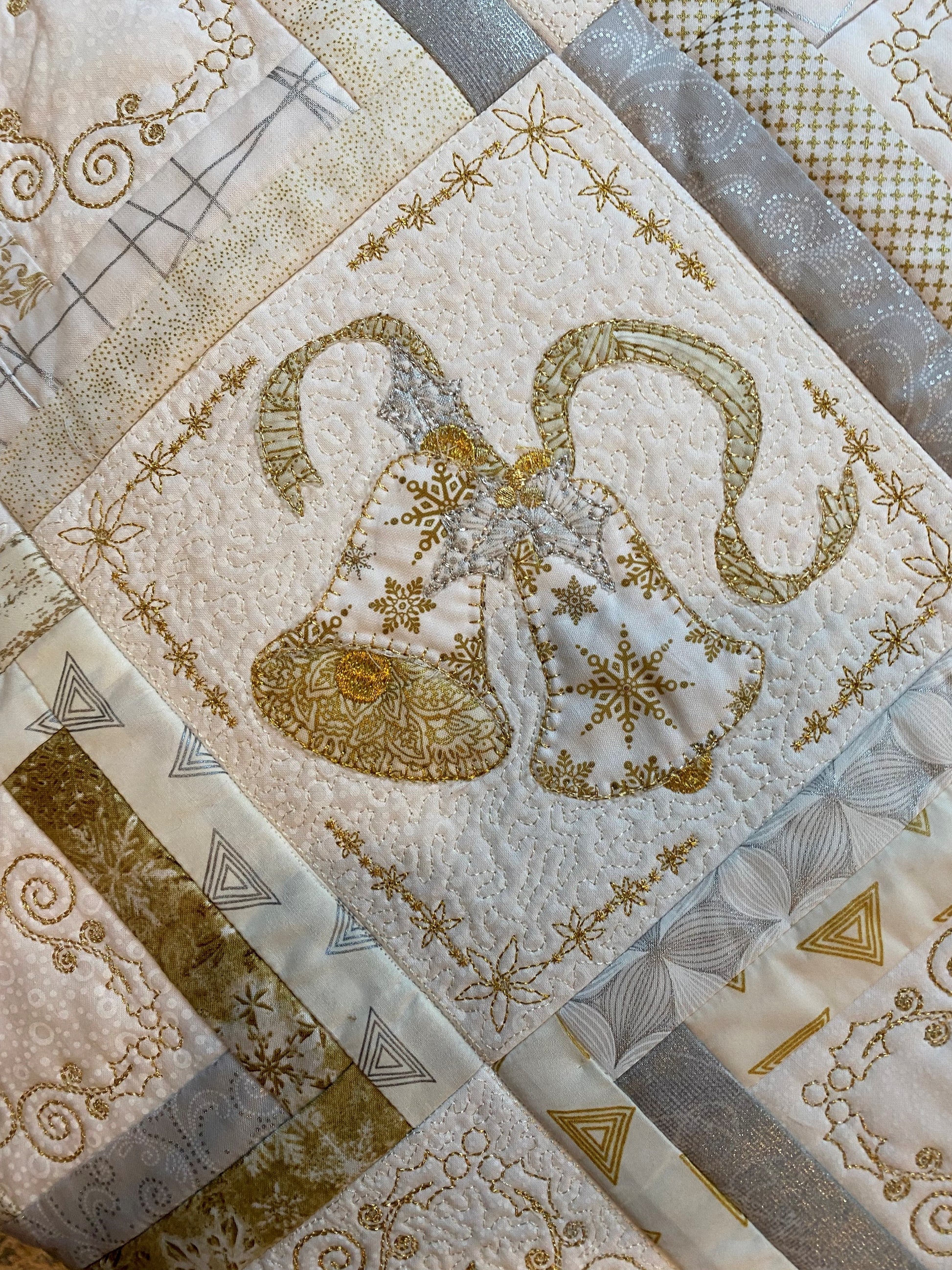 This lovely Christmas Quilt features 16 gold & silver Christmas symbols that have been appliqued and embroidered in gold on white cotton, lined with a gold and silver ornament cotton fabric and bound with gold satin ribbon. It measures 43" x 44".