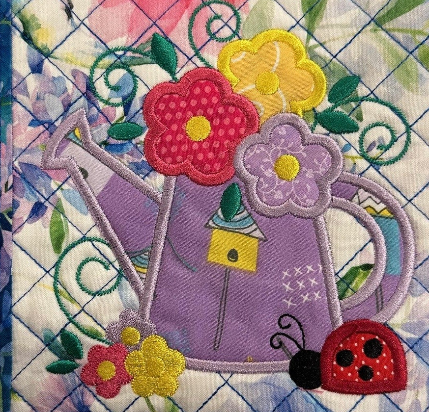 A handmade potholder with INSULBRITE to protect hands when working with hot items. This potholder features an appliqued watering can with assorted flowers and a ladybug embroidered on cotton fabric. It has a large matching ribbon loop perfect for hanging.