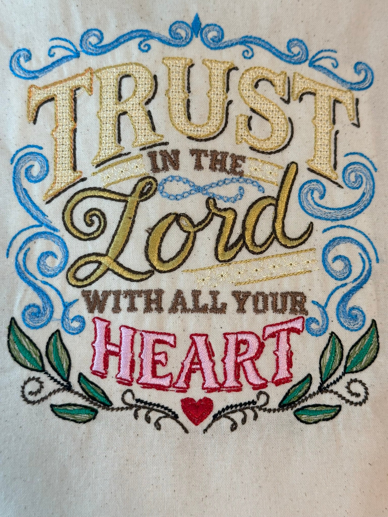 Canvas Tote Bag with Inspiring Sayings and Embroidery work. "Trust in the Lord with all your Heart" is carefully embroidered to give this bag a unique look and feel. Perfect for grabbing items at the market or collecting all the items you need to get out the door. Each tote is approximately 14.5" x 15.75". Each tote is 100% natural cotton with two reinforced handles convenient to carry in hand or wear on your shoulder. Sturdy enough for all kinds of daily use.